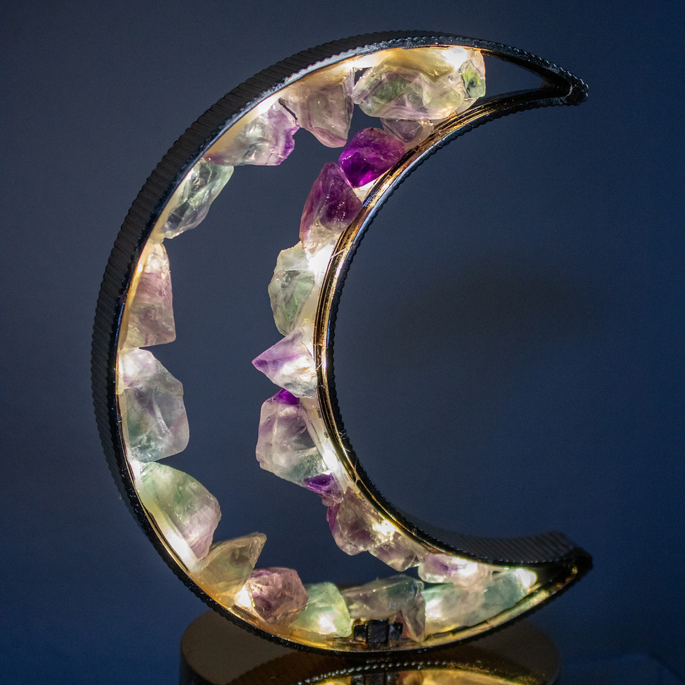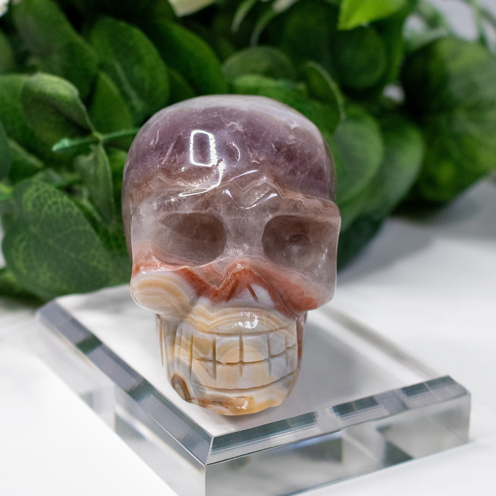 This carved skull combines amethyst and crazy lace agate to create a balance of calming, grounding, and uplifting energy.